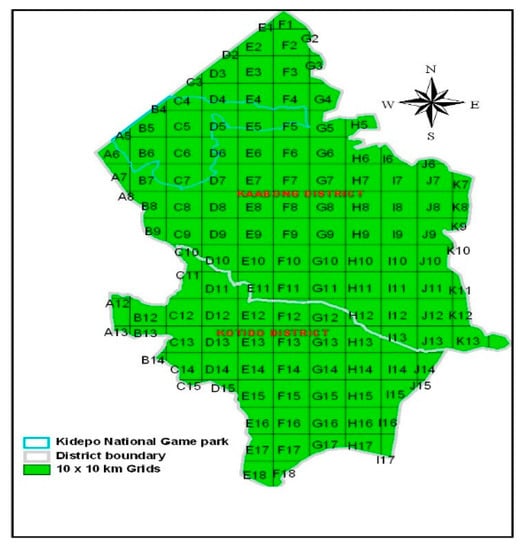A tsetse survey in the month of June-July 2016, was undertaken to provide baseline information on the Glossina morsitans distribution in northern Karamoja (Kotido and Kaabong districts). The two districts were selected because invasion reports by the District Veterinary Officers in the sub-region indicated that the two districts were most affected. Ten by ten kilometre (10 × 10 km) grids were overlain in the districts of Kaabong and Kotido. The grids were used to ensure unbiased sampling during the tsetse survey and survey team assignment. Using the grids as operational units, five teams were allocated to the survey grids, and each grid had a unique identifier code as shown (Figure 6) for ease of georeferencing and geotagging. Each team was led by an entomologist and field assistants. Sampling within the grids was based on the heterogeneity of habitats. Biconical tsetse traps were used in the survey (Figure 7). The traps were odour-baited and set at a height of 30 cm above the ground. A total of 444 georeferenced traps were established. The trapping covered all the sub-counties in the study sites. However, trapping coverage depended on the probability of registering a catch as directed by local guides. Trapping at each site lasted 72 h in accordance with the established protocol [42]. Collections were made at the end of the 72-h period. At each collection, the parameters recorded in the predesigned entomological survey sheet included the trap code, eastings (X), northings (Y), elevation (Z), vegetation type at the trap site, start date and time, end date and time, species trapped, number of females or males and flies of unidentified sex and number of other biting insects. Caught tsetse flies were identified to the species level using the Food and Agriculture Organisation (FAO of the United Nations Training Manual for Tsetse Control Personnel [43]. Fly trap density (FTD), a measure of tsetse prevalence, was obtained by dividing the total tsetse catch per trap by the number of three trap days (72 h).