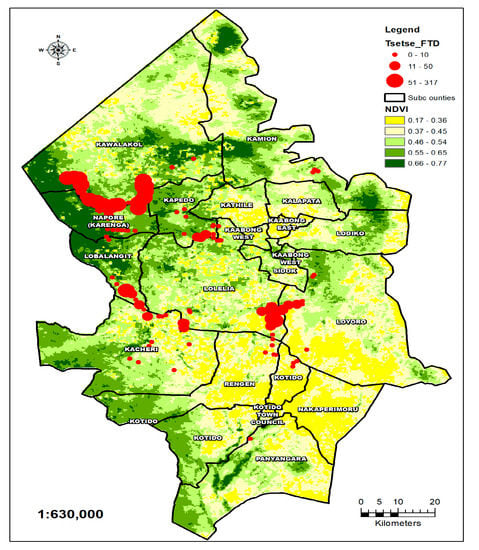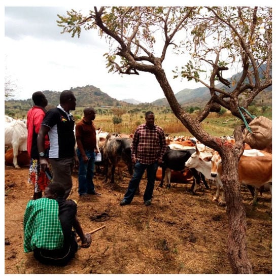 Fly trap density (FTD), a measure of tsetse prevalence, was obtained by dividing the total tsetse catch per trap by the number collected over the three trap days (72 h). To determine mean differences in the FTDs, a least significant difference (LSD) procedure using Duncan’s multiple range test for mean comparisons was used. Prior to running an LSD, analysis of variance (ANOVA) was performed to determine whether there were significant differences in FTDs among the sites. FGD data were thematically analysed. Emerging themes were grouped into thematic clusters to provide a logical result. The thematic analysis of participatory assessments was used because of its ability to provide critical insights among local pastoral communities [45,46]. Furthermore, the cross-sectional survey data were descriptively analysed, generating frequencies and means to describe the effects of tsetse at the household level.