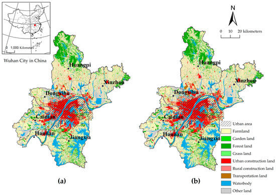 Land use types of Wuhan city in 2013 (a) and 2016 (b).