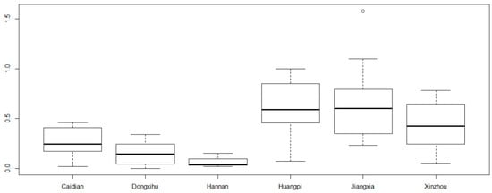 By adopting the symbiotic analysis method, the interaction between the urban area and suburban village was calculated. The real urban-suburban interaction was estimated by the combined analysis of the suburban-to-urban connection based on the questionnaire survey and the urban-to-suburban connection based on the public bus investigation. A crosstab between the estimated and real urban-suburban interaction was developed, and a chi-square test was conducted. The result (x2 = 5.915, and significance = 0.015) indicates the accuracy of the estimation of urban-suburban interaction based on the symbiotic analysis method. From the analysis results, there was apparent heterogeneity in the interactions of every suburban village with urban Wuhan. Figure 3 shows the value distribution of urban-suburban interactions of villages in every town. From the figure, Hannan interacts most weakly with urban Wuhan, and Dongxihu and Caidian are also weakly connected with the urban area. On the contrary, Huangpi, Jiangxi, and Xinzhou have comparatively strong interactions with urban Wuhan.