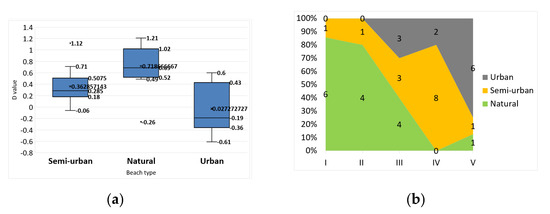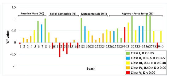 Results from the previous investigation [7] have been integrated into this paper (Table 4). Forty Italian bathing areas were assessed and classified using the CSES (Table 4 and Figure 3). Sites were categorized as follow: 7 sites (17.5%) appeared in Class I; 5 (12.5%) in Class II; 10 (25%) in Class III; 10 (25%) in Class IV; and 8 sites (20%) in Class V (Figure 3). Beach type was also categorized into natural (15), semiurban (14), and urban (11). D value of natural beaches varied from −0.26 to 1.21 with a mean value of 0.73 and showing a standard deviation of 0.36. Semiurban beaches were characterized by D value ranges from −0.06 to 1.12 with a mean value of 0.36 and the smallest standard deviation in comparison with the other categories (0.29). Urban beaches showed the greatest variability of D value (−0.61; 0.6; mean value of −0.02; standard deviation 0.41). Figure 4 and Supplementary Materials show all results in percentage and typology.