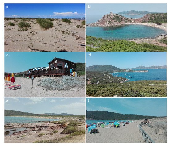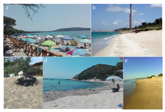 Along the Porto Torres littoral, located in the northern Sardinia coast, the study areas were Scoglio Lungo and Fiume Santo (Figure 1e). Scoglio Lungo beach, on the eastern sector of Porto Torres city, is a short beach (0.6 km long) enclosed to the west by the harbor dike and to the west by the San Gavino promontory and is a very important littoral for the resident frequentation. From the environmental point of view, this beach suffered in the past years of periodical and unauthorized nourishments that have compromised its original nature. On this beach, there are not any beach establishments, but some services are available to the users: free showers and several free parking areas [67]. Fiume Santo beach is located to the west of Porto Torres and constitutes a natural bulwark on a vast area that can be considered totally anthropized by a petrochemical industry of the nearby coast of Marinella. Indeed, the thermoelectric plants are the dominant feature of the landscape. The whole beach is free, so the bathing establishments and bars in this area are entirely absent, except for a walking kiosk that sells only beverages. The high environmental value of this coastal sector presents the S.C.I. areas “Platamona pond and juniper” and “Pilo and Casaraccio pond” and the S.P.A. “Stagno di Pilo, Casaraccio and Saline di Stintino”.