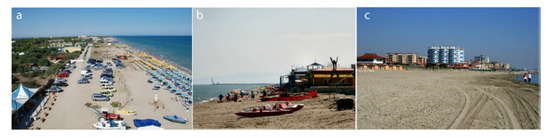 The examined coast stretch, Lidi di Comacchio, is a well-known Italian seaside resort in the Northern Adriatic Sea. It is about 16 km long and goes from Po di Goro to Porto Garibaldi including five localities: Lido di Volano, Lido di Nazioni, Lido di Pomposa, Lido degli Scacchi and Porto Garibaldi (Figure 1b). It is a microtidal environment and is defined as a low gradient sandy coast [59]. Beaches are about 20 to 60 m in width from Lido di Volano to Lido di Pomposa and from 60 to more than 100 m from Lido degli Scacchi to Porto Garibaldi [60]. The coastal dunes have been largely destroyed for the construction of seaside infrastructures, particularly from Porto Garibaldi to Lido di Nazioni, and present only some small residual dunes.