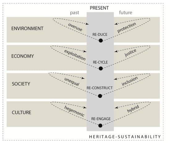 Following these conceptual principles, this article challenges any argument that view heritage as being primarily about the past and injustice, and that sustainability is about the future and justice. Instead, it is argued here that both heritage and sustainable development are essentially future-oriented processes (preserve, conserve, and maintain for the future), envisioned, negotiated, contested, designed, and managed in the present. These processes are not rooted in the past or follow an inevitable projection towards the future. Building on Borges [], the pasts, presents, and futures are plural, uncertain, and interwoven. Any change occurring across these interlinked periods of time and spaces of power is never linear. For this reason, the ways we conceive the links between these times and spaces, and the way we frame “our valuable pasts” in the present, has significant implications in shaping “our desirable future” and our envisioned past []. The awareness about the ontological and political connections that frame these assemblages can lead to an active and informed role in the production of both pasts and futures.