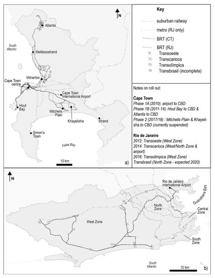 This paper focuses on two cities whose transport network has been significantly impacted by hosting MSEs: Cape Town (South Africa) with the 2010 FIFA Football World Cup, and Rio de Janeiro (Brazil) with the 2016 Olympic Games. Each city constructed new bus rapid transit (BRT systems) under the auspices of hosting a MSE, and self-identified this in their proprietary communications and strategies as a transport legacy of the MSE. Through interviews with key stakeholders located in each city, this study assesses the benefits of the MSE for transport within the cities, such as reduced travel time in Rio de Janeiro, and a step-change in the quality of transport provision in Cape Town. It also considers the longer-term operational challenges such as financial viability that these BRT systems are facing post-MSE because they have not been sufficiently contextualised to the local transport situation and/or aligned with existing plans or policies. It is worth noting that this comparative research sits within two separate larger-scale interdisciplinary projects; the first in South Africa within a 30-month project that looked at the challenges encountered by planning practitioners in the country, drawing upon 89 in-depth qualitative interviews, and a large-scale survey (e.g., [,]); and the second in Brazil, a 6-month project that examined transport resilience and climate adaptation within Rio de Janeiro via qualitative interviews. These projects provided significant insights into the understanding of the urban, environment, economic, and policy contexts of our two studied cities.