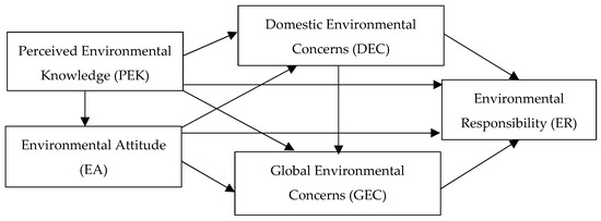 This study aims to reveal the roles of global and domestic environmental concerns in mediating the effect of environmental knowledge and environmental attitudes on people’s sense of environmental responsibility. The proposed conceptual framework for this study can be seen in Figure 1.
