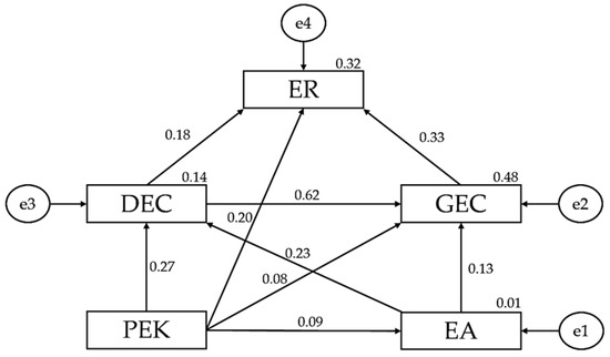Table 6 presents the effect of all variables on ER (see Table 6). The results demonstrated a squared multiple correlations value of 0.32. This means approximately 32% of the variance in ER can be accounted for by the linear combination of investigated variables, including PEK, EA, DEC, and GEC. Additionally, the results of the path analysis revealed that the predicted path from PEK and EA to DEC and GEC, and from DEC and GEC to ER, was statistically significant. Among all variables, the standardized direct effect of GEC on ER was the largest at 0.328 (see Table 7). The standardized direct effect of DEC on ER was 0.181. The predicted path from PEK to EA was also statistically significant, and the standardized direct effect was very small at 0.087. The predicted path from PEK to DEC was statistically significant, and the standardized direct effect was 0.271. The predicted path from PEK to GEC was statistically significant, and the standardized direct effect was 0.076. The effect of DEC on GEC was the strongest (0.618), compared to all paths. Additionally, both DEC and GEC mediated the effect of EA on ER, and the effect of PEK on ER. Most importantly, GEC mediated the effect of DEC on ER.