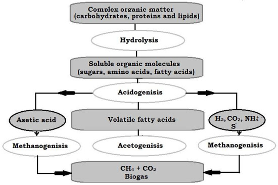 The methane fermentation process consists of four phases (hydrolysis, acidogenesis, acetogenesis and methanogenesis) [19]. The main stages of anaerobic digestion are presented in Figure 1.