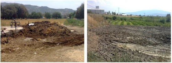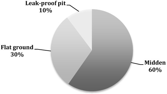 In the study area, manure storage facilities are located in the open area. The most common type of manure storage is midden (60%), and 30% and 10.3% of farms store the manure on flat ground and on leak-proof pits, respectively. Figure 3 presents the types of manure storage used in Aydın region. Manure stored on flat ground is shown in Figure 4.