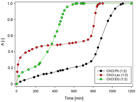 The selection of the absorption solvent is particularly important in the absorptive desulfurization process. Three types of DES were tested, including ChCl:Ph, ChCl:Lev, and ChCl:EG in a 1:2 molar ratio (Figure 1). In the experiment, the following pre-selected absorption conditions were used: 50 mL of DES; initial concentration of DMDS 1 mg/Nm3, 25 °C temperature; model biogas flow rate 50 mL/min. Among the investigated DESs, ChCl:Ph shows the best absorption efficiency. After 800 min, the absorptivity value for ChCl:Ph was below 0.3 and then increased rapidly over the next 300 min, which indicates DES saturation. The saturation time of the other two DES was 600 and 800 min for ChCl:EG and ChCl:Lev, respectively. It can be noticed that the best result was obtained for DES which has the lowest viscosity value. As the viscosity increased, both the absorption capacity and absorption rate decreased. In DES with higher viscosity, the mass transfer is hindered, therefore it is preferable to use solvents with the lowest viscosity.