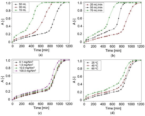 Experimental breakthrough curves of DMDS absorption with ChCl:Ph at different: (a) volume of DES; (b) biogas flow rate; (c) initial concentration of DMDS; (d) temperature.