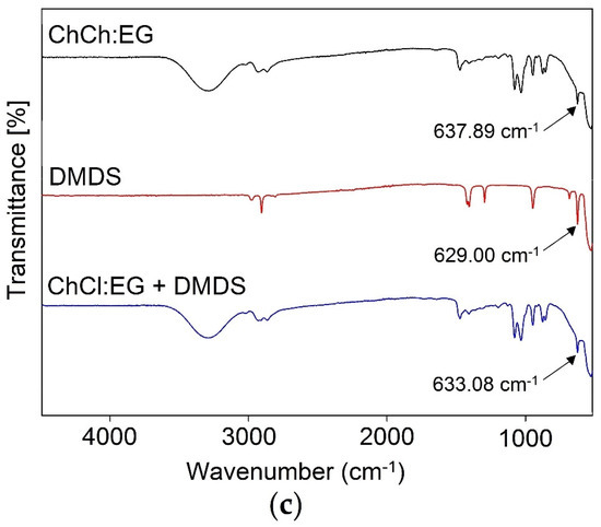 FT-IR spectra of: (a) pure ChCl:Ph, pure DMDS, and DES after the DMDS absorption process; (b) ChCl:Lev, pure DMDS, and DES after the DMDS absorption process; (c) pure ChCl:EG, pure DMDS, and DES after the DMDS absorption process.