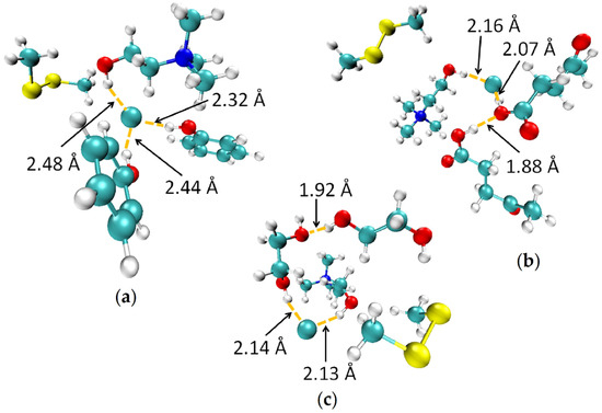 Optimized configurations of (a) ChCl:Ph-DMDS; (b) ChCl:Lev-DMDS; (c) ChCl:EG-DMDS. Carbon and chlorine atoms are displayed in light blue, nitrogen atoms are in dark blue, oxygen atoms are in red, sulfur atoms are in yellow, and hydrogen atoms are in white.