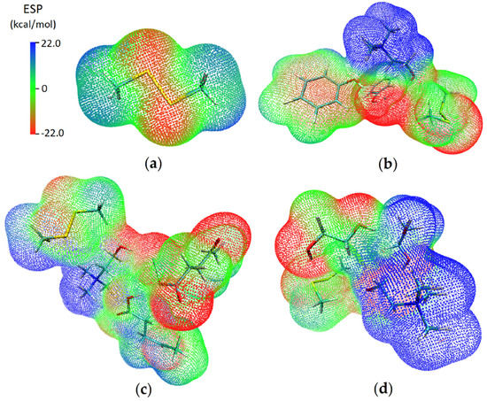 Electrostatic potential mapped on electron total density with an isovalue 0.001 for (a) DMDS; (b) ChCl:Ph-DMDS; (c) ChCl:Lev-DMDS; (d) ChCl:EG-DMDS. Blue color represents positive charges, red color represents negative charges.