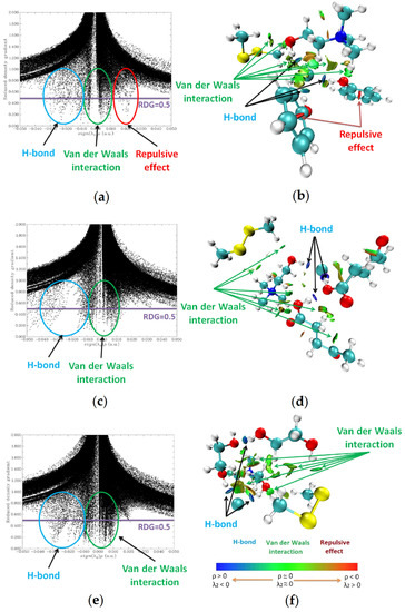 RDG isosurfaces (s = 0.5 a.u.) and 2D diagrams of electron density and its reduced density gradient for (a,b) ChCl:Ph-DMDS; (c,d) ChCl:Lev-DMDS; (e,f) ChCl:EG-DMDS.