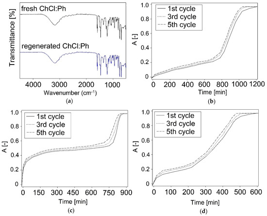 (a) FT-IR spectra recorded from on fresh ChCl:Ph, regenerated ChCl:Ph, and the reusability of DES: (b) ChCl:Ph; (c) ChCl:Lev; (d) ChCl:EG.