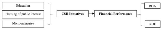 We introduced two financial corporate performance models (Equations (1) and (2)). For the financial corporate performance model, we use return on assets (ROA) and return on equity (ROE) as the dependent variable, while CSR initiatives are the independent variable.