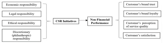 The second model includes the non-financial corporate performance as a dependent variable while CSR initiatives are considered as explanatory variables using a sample of 228 records from a self-designed online questionnaire. We found that non-financial corporate performance is positively affected by CSR initiatives. We show that economic, legal, ethical, and philanthropic responsibility initiatives in CSR have a significantly positive relationship with the non-financial corporate performance. Moreover, the non-financial corporate performance is positively affected by customer’s brand trust, customer’s brand loyalty, customer’s perception of quality, and customer satisfaction. These results are aligned with the study of Yoon et al. [34] because clients recognize CSR activities as positive brand initiatives. Customers increase their purchase intention and their willingness to pay more for a particular product or service upgrade, which is considered a necessary input of effective corporative strategy and has a direct positive effect on long-term corporate profitability.
