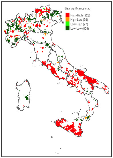 The spatial autocorrelation analysis (Exploratory Spatial Data Analyis, ESDA) was carried out in order to identify atypical locations and outliers, to verify the presence of clusters or hot spots of locations with similar behavior, and therefore to suggest the presence of spatial patterns. The data has been arranged in a matrix that gives an account of its spatial ordering in terms of territorial contiguity: , with if two municipalities i and j are contiguous, otherwise , where ni is the number neighboring municipalities in a given area i. Subsequently, the well-known Moran index of spatial autocorrelation, I [62], on a global scale and the Local Moran index (LM) [63] were calculated at the municipal level in order to highlight the municipalities that contribute in a meaningful way to global spatial autocorrelation.