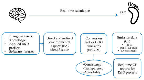 The identification and calculation of intangible assets are difficult and fuzzy in different disciplines such as intellectual capital, research performance, and also the carbon footprint since it is required to convert intangible (knowledge) into tangible indicators [6,7]. This research project contributes to identify environmental aspects related to technological research in intangible assets, which are used to measure the environmental dimension of sustainable development. Thus, the center measures greenhouse gas (GHG) emissions of every aspect identified, the sum of which gives its carbon footprint (CF) based on intangible assets. Toward optimum performance, the center controls and continuously improves its daily activities on a voluntary basis under international standard certifications for quality management [8], R&D management [9], and environmental management [10]. In addition, specific training actions are implemented for different levels of responsibility, as, paraphrasing E. Sidiropoulos [11], sustainability is considered a “learning journey”. In addition to the actions described above, the center considers it necessary to boost awareness of environmental impacts when dealing with intangible assets, as the ability to perceive, feel, or be conscious of environmental issues has a positive and significant influence on environmental behaviors [12].