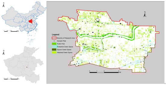 Urban green spaces regulate regional microclimate via shading, evapotranspiration, boosting air movements, and increasing heat exchange, which mitigates urban heat island (UHI) effects at a city scale [,,]. Furthermore, vegetation in green spaces can not only intercept rainfall and reduce rainfall runoff, but also bring more rainfall infiltration, which decreases the frequency of urban floods and stormwater treatment costs and damages []. These ecological benefits are based on the composition and structure of the urban forest, which is crucial for improving and regulating the urban environment []. Exposing how different types of urban green spaces impact ecosystem service performance could help policymakers and urban planners to optimize green space planning and maximize ecosystem services provision. However, there are many studies focusing on how vegetation types like trees, shrubs and herbaceous, or vegetation communities perform in ecosystem services provision [,,,,,,]. There are comparatively few studies concerning different types of urban green space ecosystem service provision and baseline information is not available on the vegetation structure, ecosystem benefits, and value of various types of urban green spaces in Luohe. An assessment of the city’s urban green spaces is also needed to make the policymakers, urban planners, city managers, and the general public aware of the ecosystem services that their green spaces provide to better preserve, manage, and maintain the existing urban green spaces in Luohe. In this paper, a spatial distribution database of the four types of urban green spaces was acquired by high-resolution aerial images interpretation and pre-stratified random plots were created to collect vegetation information of the four types of urban green spaces. An i-Tree Eco model was then used to assess their vegetation composition and structure and ecosystem services. Using these methods, the paper explores how different types of urban green spaces perform in ecosystem services provision in Luohe. The baseline information could be used for optimized management decision-making and planning, developing suitable policies, and setting a maintenance plan for Luohe. Better-treated urban green spaces in this area could contribute to air quality improvement and a better living environment for the general public. The selected ecosystem services in this study were carbon storage and sequestration, air pollution removal, and runoff avoidance. Because all the sample plots were created within the green space, and there was less building information in these sample plots, energy saving was not discussed in this study. The objective of this study is to reveal the difference in vegetation structure of the four types of urban green spaces, to highlight how the various types of urban green spaces perform in ecosystem service provisioning in Luohe, and to demonstrate how to increase and maximize the ecosystem services provisioning in the future.