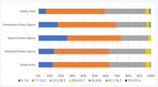 Concerning the tree age distribution (Figure 3), more than 62.7% of trees had DBH ≤ 15.2 cm in the whole study area, which means that there are abundant young trees and, thus, a potential to contribute to urban ecosystem services provision in the coming years. Only 4.5% of trees with DBH were higher than 30.6 cm. Results showed a similar ranking with tree density concerning tree and shrub leaf area density and leaf biomass, where protective green spaces had the highest leaf area density, followed by public parks. However, square green spaces yielded the highest leaf biomass with 12,976.5 kg/ha (Table 3), while attached green spaces had the lowest leaf biomass with 7735.6 kg/ha. It is notable that shrubs in square green spaces made significant contributions to leaf biomass, which was equal to half that of the contribution of trees.
