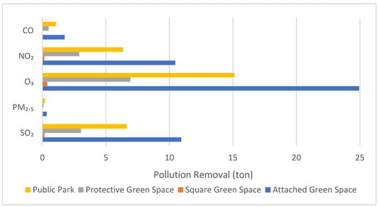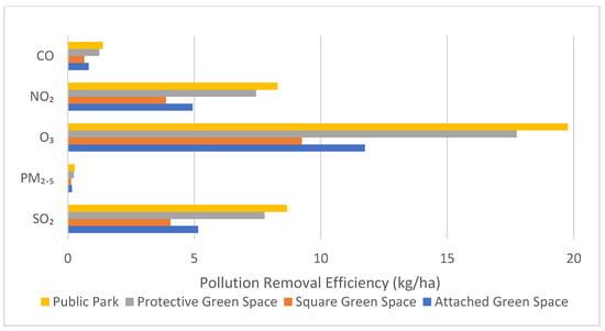 Since the 1950s, air quality issues have been a major concern worldwide []. Air quality is therefore not only a pressing public health issue but is also affects ecosystem health []. Trees in urban areas could remove air pollutants and improve air quality by absorbing harmful gas from cars or plants and intercepting particulate matter [,,,]. Trees could absorb and filter large amounts of particulate matter, nitrogen oxides, and sulfide every year [,]. i-Tree could quantify and estimate the total amount of various harmful substances in the air purified by trees []. As shown in Figure 4, about 92 t of air pollutants (CO, NO2, O3, PM2.5, SO2) were removed by all the trees in 2013. Of these pollutants, there were more than 47.4 t of O3 removed by trees accounting for 51.5% of total pollutants. Only 0.6 t of PM2.5 was removed in 2013. A similar trend can be seen with total leaf area ranking, the highest pollutant removing capacity was found in attached green spaces with 48.4 t in 2013 and square green spaces had the lowest capacity with 0.7 t. In terms of the efficiency of the removal of different pollutants (Figure 5), the four types of green spaces had obvious differences in the removal of various air pollutants ranging between 0.13 kg/ha to 19.8 kg/ha. Attached green spaces could remove 19.8 kg per ha, while only removing 0.27 kg of PM2.5. Square green spaces had the lowest air pollution removal capacity from 0.13, 0.65, 3.9, 4.1, 9.2 kg/ha, PM2.5, CO, NO2, SO2, O3, respectively.