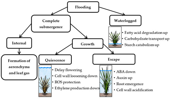 Generally, stagnant flooding occurs as a result of heavy rain, which can be deep-water flooding or flash flooding. Under deep-water flooding, plants increase their stem length (internode) to escape the submergence. However, after the flood subsides, affected plants are prone to lodging and eventually this leads to death due to the exhaustion of reserved nutrients within few days. Contrarily, during flash flood, plant growth is restricted and resumes after occurrence of the flood [20]. Regardless of the temperature, duration, and depth of the flood, flood has a major impact and threatens plants with a shortage of carbohydrates and cellular energy, which hinders growth and development (Figure 2). Rainwater flooding is usually clear water, which results in less crop damage as compared to turbid or silted water. Hence, comprehensive knowledge of the relationship between plant survival and flood water qualities is a prerequisite for the development of flood tolerance and sustainable flood management practices.