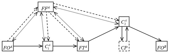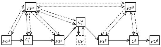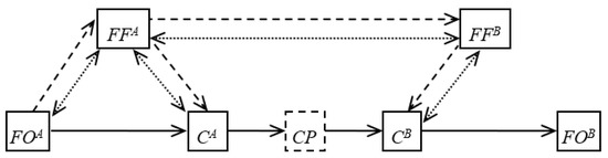 In this case, the freight owner declares its need to deliver a consignment. The freight forwarder, having received the request, concludes that of the many alternative options for the logistics chain structure, the option with two cargo terminals will be the most effective one. After that, the freight forwarder determines the regional carrier for the delivery of the shipment from the shipper to the terminal, concludes an agreement with the terminal and the main carrier, and then also sends a request for the delivery of the shipment to a foreign partner forwarder. The partner forwarder organizes the delivery of the consignment from a terminal in his region to the consignee. For this, it determines the regional carrier and enters into an agreement with the terminal. For this LC variant, the following agreements are signed: in the consignor region—between the freight forwarder and the cargo owner, between the forwarder and the regional carrier, between the forwarder and the cargo terminal in the sender’s region, and between the forwarder and the international carrier; in the consignee region—between the forwarder and the cargo terminal in the recipient region, between the forwarder and the regional carrier; also, a contract is concluded between the two forwarders. The freight forwarder in the sender region from the remuneration received from the freight owner pays for the services of regional and international carriers, the terminal in his region, as well as the partner forwarder services. The freight forwarder in the recipient region pays for the services of the terminal and the carrier in its region from the funds that are received from the first freight forwarder. It is also possible that the terminal pays the carrier’s services in the sender’s region, and the carrier’s services for delivering the consignment to the consignee are paid by the freight terminal in the recipient’s region.