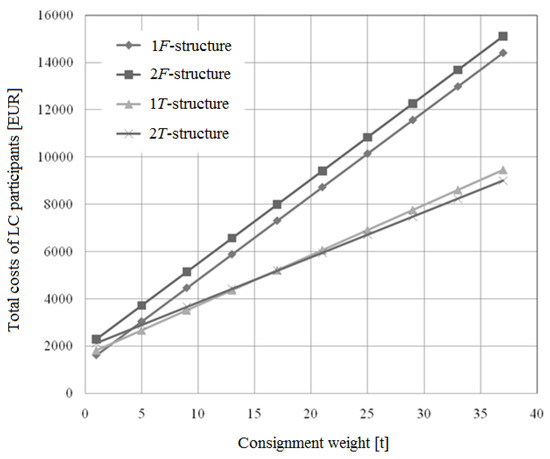 Figure 6 shows the dependence of the total costs of the LC participants from the consignment weight for the request interval equal to 96 h and the delivery distance equal to 3000 km (the values of other numeric parameters, needed to calculate the total expenses, were taken as the market averages for deliveries between Poland and Ukraine in May 2019). There are points of intersection for 1F- and 1T-variants of LC, as well as for 1T- and 2T-variants, as it can be seen from the graphs. Thus, it can be argued that, in this case, there are areas of the most efficient use for 1F-, 1T-, and 2T-variants of LC. It is sufficient to determine the roots of the equation to determine the boundaries of the areas of the most efficient use of the i-th and j-th variants of the LC