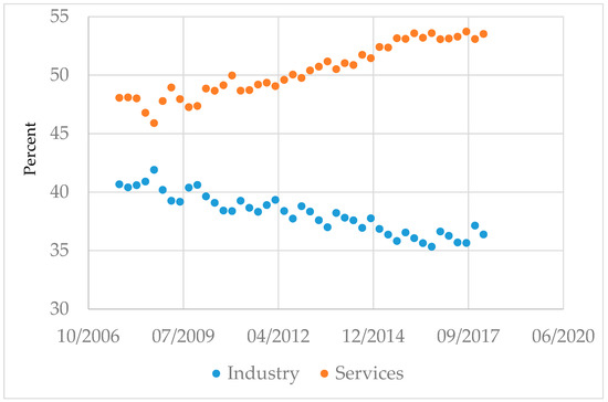 There are two specific reasons to study the developing economies of ASEAN. First, as an entity, it has already become services dominant. Figure 1 shows that the tertiary sector has experienced a steady rise in recent years with its share to GDP (gross domestic product), approaching 55%, whereas manufacturing’s contribution to GDP declines concomitantly, constituting one-third of the economy. Thus, innovation in services will largely determine ASEAN’s aggregate productivity performance, critical to avert the middle-income trap. Second, studies noted that the application of microdata to understand the various dynamics of innovation and productivity is relatively new to the Southeast Asia region [21]. Our literature review also suggests that there is no study on R&D and innovation in service firms of the region. As such, our study can add significant value by providing insights from microdata on the association between R&D and innovation. As Crespi, Tacsir [22] observed: “Considering the innovation results from the investment decisions made by individual firms, the microeconomic analysis has the potential to enlighten the foundations of the correlations found at the macrolevel.”
