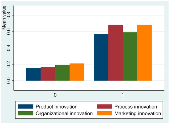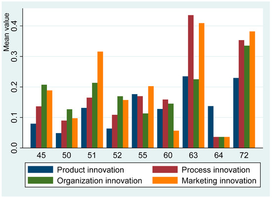 While the estimates based on H1 could provide the evidence of heterogeneous impacts of R&D on innovation, such results could mask an important insight on firms’ innovation behavior: the complementarities (or substitutability) between different innovative activities. In other words, unobserved firms’ characteristics could influence firms’ innovation decisions on the four types of binary dependent variables (i.e., product, process, organization, and marketing) that we have. As Cirera [32] observed, “one vital component in the decision to innovate is that firms decide at a time what innovation results to produce based on existing knowledge capital investments. For this reason, one should expect some interdependency between the decisions to undertake product and process innovation, and perhaps organizational innovation.” Given the moderate to high correlation between various types of innovation in our sample (between 35 to 48 percent), firms’ decision to introduce product or process innovation, for instance, may not be independent of organization or marketing innovation. Further disaggregated data, based on the services subsector and reported on the horizontal axis of Figure 3, show that there is marked heterogeneity in terms of the services firms’ innovation preferences.