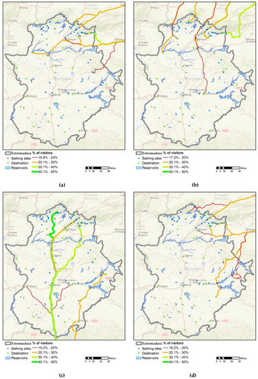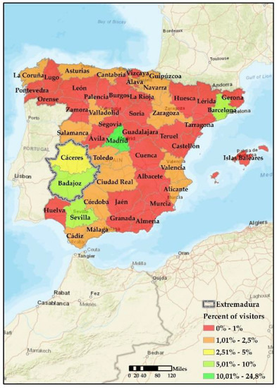 Extremadura has a strong capacity for attracting tourists interested in its attractions, among which all those linked to the resource of water are particularly noteworthy. This affirmation is corroborated when the origin of the visitors is analyzed since tourists come from all over Spain (Table 8 and Figure 3). Nevertheless, their percentage is very variable owing to two essential factors: the number of inhabitants living in the province and the proximity of the area of study in line with that observed in the specific literature [12,64].