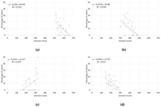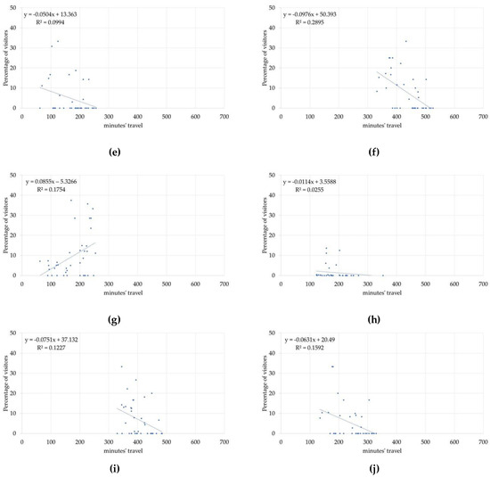 The relation established between the travel time calculated in one direction (origin-destination) is inverse in most cases, since as it increases the percentage of visitors to a given space falls. It is however observed that there is a positive relation regarding those from the provinces of Cadiz or Seville; this circumstance can be attributed to the fact that their preferred destinations are to be found in the north of the province of Cáceres, the area the furthest away from the provincial capitals mentioned.
