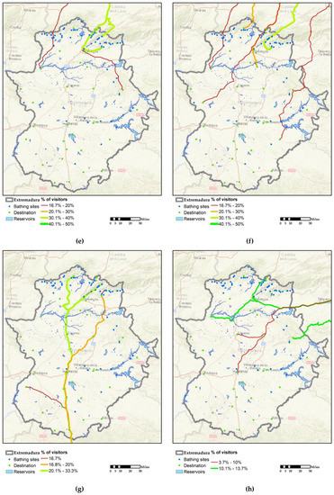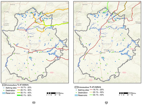 Percentage of visitors practising tourism in rivers, gorges, and reservoirs according to their provinces of origin: (a) Barcelona, (b) Vizcaya, (c) Cadiz, (d) Madrid, (e) Salamanca, (f) Guipúzcoa, (g) Seville, (h) Toledo, (i) Valencia, and (j) Valladolid.