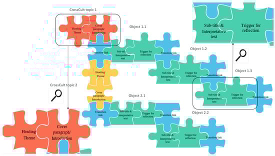 This Figure presents an illustration of the CrossCult stories model and its recursive structure: (a) Each block (painting, text, transition link) in this sequence (objects 1.1, 1.2, 2.1, 2.2) describes one aspect of the related painting. (b) Each sub-unit (see the magnified puzzle pieces on the top right-hand side corner, subtitle and interpretative text and trigger for reflection) provides a highlight. (c) All sub-units (up to 7 in our case) present a story (CrossCult topic 1) that connects objects under a specific theme, the interpretive narrative (heading theme, cover paragraph/introduction, (see the magnified puzzle pieces on the bottom left-hand side corner).