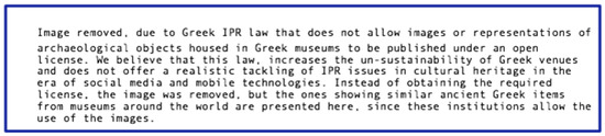Similarly, the more than 70 narratives created for the Archaeological Museum of Tripolis involved both venue-specific and venue-independent elements, allowing them to be reused in other settings: Straightaway, in tens of small and medium-sized museums all over Greece, and with some more editing (and adopting a more abstract or comparative focus) in many others worldwide. The narratives for the Archaeological Museum of Tripolis were presented to the visitors in the form of videos. Subtitles were also available for people with hearing impairments. The text in Table 2, although written for the Archaeological Museum of Tripolis and the specific object shown in Figure 3, is one clear example (in italics, the parts that are venue- and object-specific, to be removed or replaced for other contexts). The same narrative can be used in different museums where images of ancient Greek girls and women appear, like in the ones in Figure 4. Likewise, elements from other narratives that revolve around the rich Greek mythology may be re-used with a cross-border perspective to reflect on comparisons with myths coined in the places of origin of the museum visitors (e.g., comparing creation myths around the world). Thus, by generalising reuse, small venues would increase their sustainability prospects, providing meaningful experiences to the visitors with reduced cost of producing content.