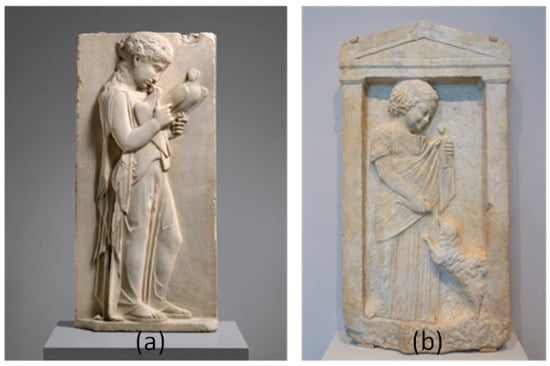 (a) The image on the left hand side is a marble grave stele of a little girl ca. 450-440 BC from the MET, available from https://www.metmuseum.org/art/collection/search/252890. (b) The image on the right hand side is a grave stele of a young girl ‘Melisto’, Greek, Attic, ca. 340 BC, marble, probably from Sounion—Arthur M. Sackler Museum, Harvard University.
