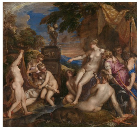 Similarly and vice versa, a sculpture of an ancient woman from the Archaeological Museum of Tripolis connected to the topic ‘Daily Life’, was not simply accompanied by a single digital image of that artefact but also by a short video describing the daily life of a woman in ancient Greece, an additional image of a similar sculpture dated to the Roman times, a piece of narrative about motherhood in Antiquity, an audio serving as an initial trigger prior to engaging with the item itself, etc. More specifically, some of the narratives presented to the visitor of the Archaeological Museum of Tripolis were enriched with digital material from the NG, increasing digital connections of the museum content and enhancing its collection. For example, when introducing the myth of Artemis and Callisto at the Archaeological Museum of Tripolis regarding a statue of Artemis, the narrative (see Table 4) presented a painting by Titian from the NG Collection (see Figure 6), depicting exactly that topic and related content from the ‘Diana and Callisto’ Schools Project (see https://www.nationalgallery.org.uk/learning/teachers-and-schools/diana-and-callisto-schools-project).