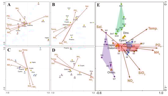 Canonical correspondence analysis (CCA) biplots of the phytoplankton community and environmental factors in the SRE. (A) Spring, (B) Summer, (C) Autumn, (D) Winter, and (E) all seasons combined. S.: spring; Sm.: summer; A.: Autumn; W.: winter; Temp.: temperature; Sal.: salinity; Dino.: dinoflagellates; Chloro.: chlorophytes; Crypto.: cryptophytes; Cyano.: cyanobacteria; Hapto.: haptophytes; Prasino.: prasinophytes.