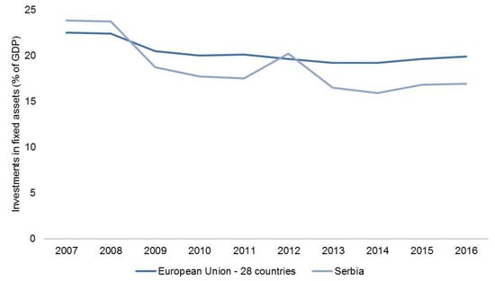 Today, Serbia is technologically lagging behind European industries and needs strong domestic industry to ensure economic sustainability. Serbian industry was largely devastated due to sanctions and wars in the 1990s. During that period, separated from foreign markets, it was impossible for Serbian industry to keep track of technological development. Isolation, as well as the lack of financial resources, made fixed assets technologically obsolete and poorly maintained. Foreign direct investments (FDI) are important, especially those with high technological intensity—bringing in new technologies and new knowledge, and employing domestic labor, but profitable domestic investments in fixed assets—which are not just the path to unjustified and excessive borrowing, represent one of the most important factors for abandoning a perennial economic stagnation. Figure 1 shows investments in fixed assets as percentage of gross domestic product (GDP) [], where we can see that these investments in Serbia are mainly below European average.