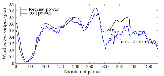 The short term forecast of wind power is usually conducted on a day-ahead basis. It provides system operators with the estimations of wind power outputs for the next day. Based on the forecast information, the system operator can determine the generation plans for the next day. Figure 1 presents a 5-day snapshot of historical data of forecast and real powers. The resolution of the data set is 15-min. Therefore, this data set has a total of 480 data points. The forecast values are obtained by point forecast tool, i.e., the forecast power is a deterministic value in each period. However, due to the stochastic nature of wind speed and direction, there are deviations between the forecast and real powers. In this case, the actual wind power output pw,r can be represented as the superposition of its forecast value pw,f and corresponding error pw,e, as follows: