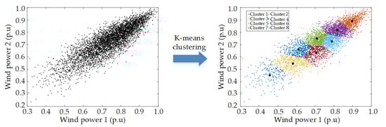 Based on the samples of wind power, this paper adopts the K-means algorithm to group the wind powers into serval clusters. Data clustering is the process of grouping a set of data based on its characteristics. K-means clustering technique has been widely used in many aspects of the power systems [32,33], and it proved to be an efficient way to realize the classification of data. K-means algorithm aims to find the optimal cluster centers to minimize the sum of the Euclidean distance between all data points and the cluster centers. The objective of K-means clustering can be written as: