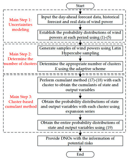 Figure 3 presents the computational procedure of the proposed ACCM for probabilistic assessment of distribution networks. The proposed framework has three main steps. The first step of the framework addresses the uncertainties of wind power. In this step, the dependence between historical forecast and real data is established, as described in Section 2. Then, based on the short term forecast value, the probability distribution of wind power in each period is calculated. The second step aims to determine the appropriate number of clusters. In this step, the samples of wind power are generated using the Lain Hypercube sampling technique. Then, the appropriate number of clusters is determined by the proposed adaptive scheme in Section 3.3. Based on the results in the previous two steps, the third step aims to perform the cluster-based cumulant method (17)–(19) is to obtain the statistical moments and probability distributions of output variables. Since the number of clusters is K, the proposed method requires K times load flow calculation to obtain the final results. The obtained results provide DNOs with an understanding of the operating state of the systems with the consideration of forecast errors. Moreover, the obtained probability distributions of output variables help DNOs to underlying operational risks of systems.