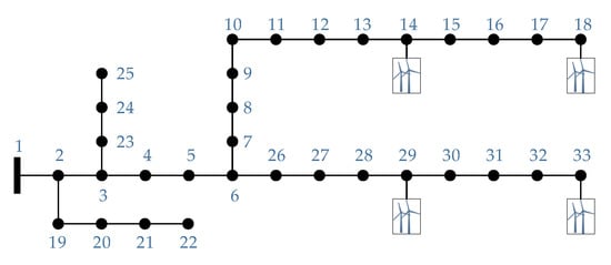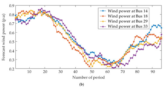 The IEEE 33-bus distribution system is applied in the comprehensive investigation of the performance of the proposed framework. The detailed parameter of the test system can be found in [33]. In this case, four small wind farms are integrated into the system at Bus 14, 18, 29, and 33, as shown in Figure 4. The nominal power of each wind power is set equally as 0.85 MW. The locations for DGs integrations are selected at the end of feeders. The deployment aims to supply local loads with DGs outputs, thereby reducing the extent of voltage drop. The historical data sets of forecast and real wind powers are derived from the wind farms in Hubei province, China. The resolution of the data sets is 15-min. Therefore, the assessment includes the operating states of the system for a total of 96 periods.