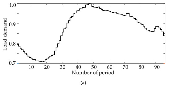 Figure 6a presents the curve of forecast load demand. The original load of the test system is defined as Pload,max, and the ratio of forecasting load at each period to the maximum load is defined as Pload,f/Pload,max. The uncertainties of loads are assumed to be Gaussian distributions with standard deviations of 10% [11,26] of their expected values. Figure 6b shows the curves of the forecast power of four wind farms. In the test system, four wind farms are sufficiently close geographically. Therefore, the forecast outputs of these wind farms have a similar trend. It can be observed that the forecast wind powers show different characteristics compared with the load. The output of wind powers is relatively large at night-time, while the load is opposite. Due to the mismatch of sources and loads, the operating states of the system in different periods need to be analyzed in detail.