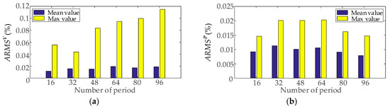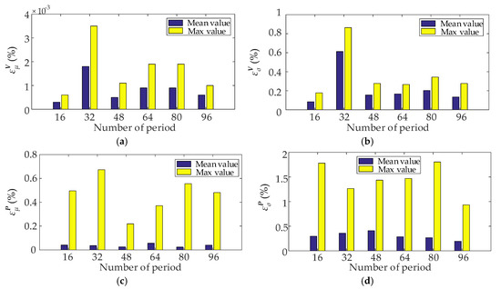 The proposed ACCM is performed to evaluate the operating state of systems in each period. The relative errors and ARMS in (22) and (23) are adopted to verify the accuracy of ACCM. The accuracy of both state and output variables are analyzed, including voltage magnitude, voltage angle, active power, and reactive power. For brevity, only the results of voltage magnitude and active power are presented. Figure 8 presented the results of relative errors. Relative errors provide indicators of the accuracy of expected value μ and standard deviation σ. It can be found from the results that the proposed method could provide the estimation of statistical moments with high accuracy. For voltage magnitude, the maximum errors are observed in period 32. In this case, the mean and maximum relative errors of the expected value of the voltage magnitude are only 0.0018% and 0.0035%, respectively. It is worth to mention that the relative errors in different periods vary in small ranges. The results demonstrate the robustness of the proposed ACCM in evaluating operating states in different periods.