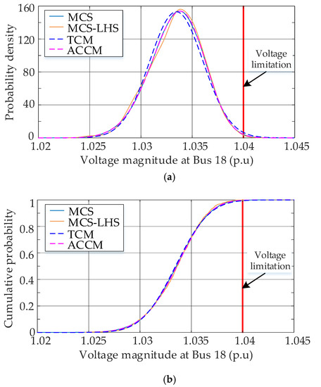 The graphical results of voltage magnitude are also presented to demonstrate the effectiveness of ACCM. The probability distributions of voltage magnitude at Bus 18 in periods 16 and 48 are presented in Figure 10; Figure 11, respectively. The results of MCS, TCM, and MCS-LHS [14,15] are adopted to render comparative results. The sample size of MCS is determined by the maximum variance coefficient of output variables, i.e., βmax < 1%. While the trial number of MCS-LHS is selected as 1000 [15]. As it is observed from the results, the proposed ACCM can provide more accurate estimations of probability distributions than TCM and MCS-LHS.