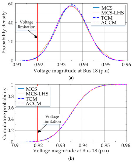 The normal operating range of voltage magnitude is assumed as 0.92–1.04 p.u [6]. As shown in Figure 10 and Figure 11, Bus 18 experiences overvoltage in period 16 and undervoltage in period 48. Moreover, the risk values of events are very small, which means that the obtained probability distributions should have high accuracy in the tail regions. ACCM, TCM, MCS-LHS, and MCS are used to calculate the probability of risk, as shown in Table 3. It can be found that TCM and MCS-LHS are less accurate in the tail regions of distributions. In contrast, the results obtained by ACCM have minor errors from the accurate values obtained by MCS. Therefore, the proposed method can help DNOs identify the variables that may endanger the system.