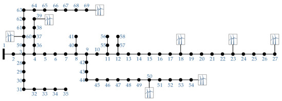 In this section, the performance of the proposed ACCM is analyzed in a relatively large system. Figure 12 presents PG&E 69 bus system with the integration of 8 DGs. For simplicity, only the operating states in period 48 are presented. The original load of the test system [30] is defined as 0.85 Pload,max. The wind farms are integrated into the system at Bus 18, 23, 27, 39, 50, 54, 60, and 69. The nominal power of each wind power is set equally as 0.50 MW. The forecast data of load and wind power are the same as the data in the case studies of the IEEE 33-bus system.